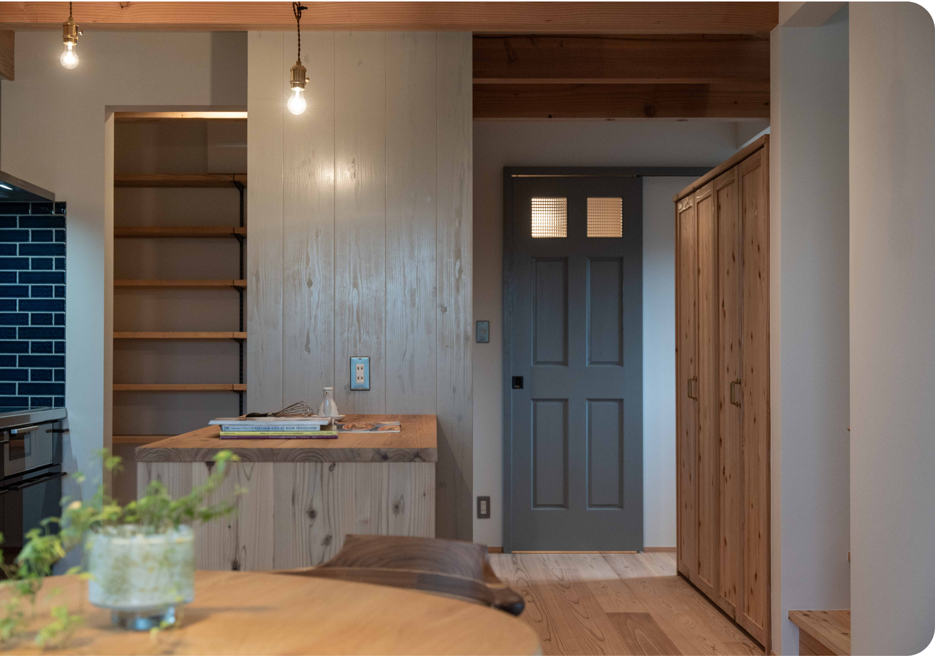 森の気配いっぱいの無垢材と住宅性能にこだわり、構造にも断熱性にも妥協せず「板倉HOUSE」と同じ哲学で作り上げた木の家です。