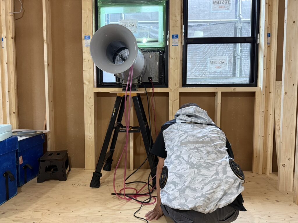 先日、大津市南郷で施工中の平屋のお家にて、気密検査を行いました。